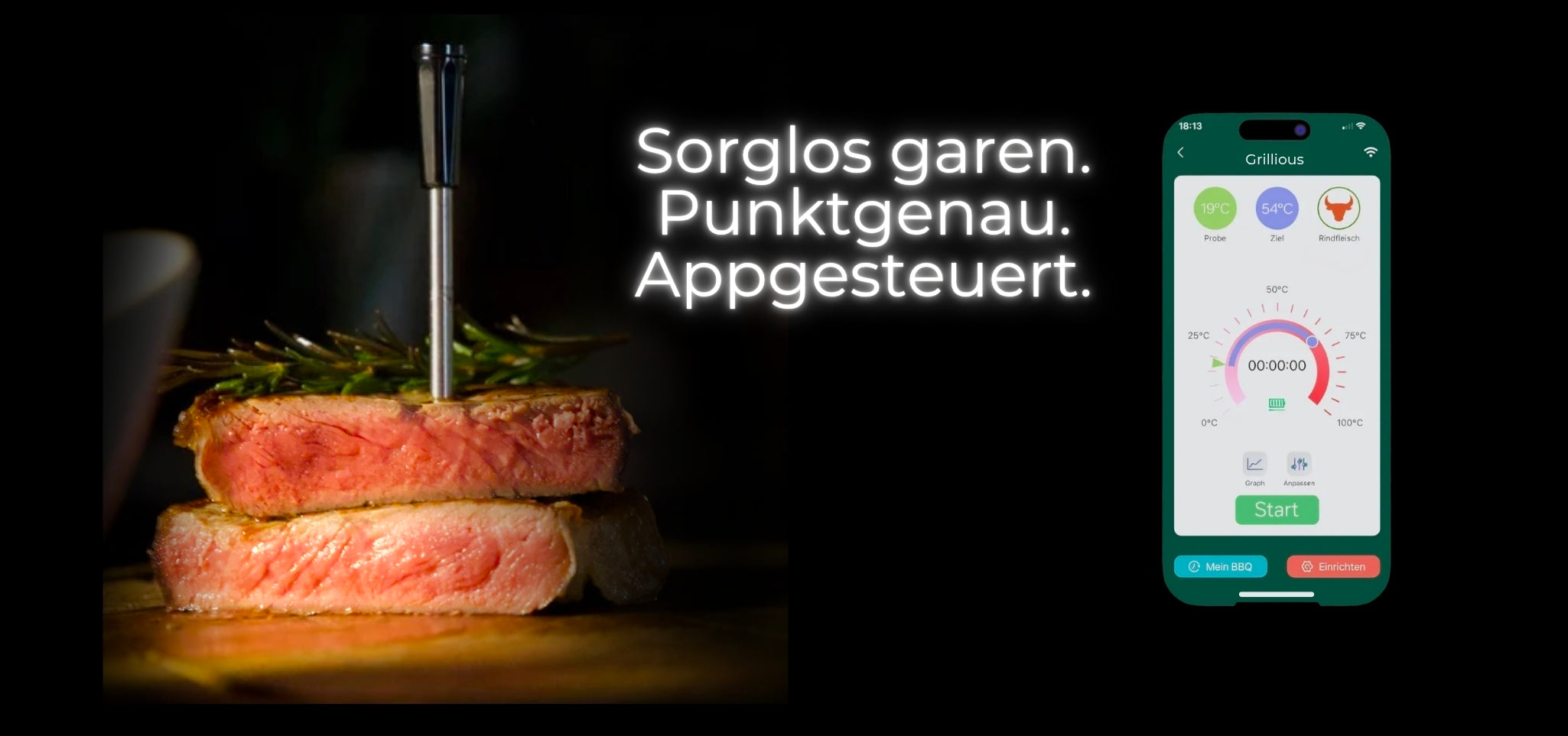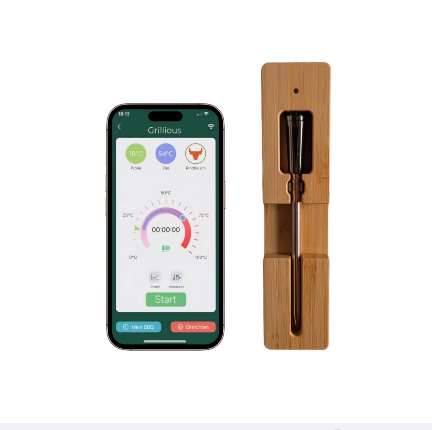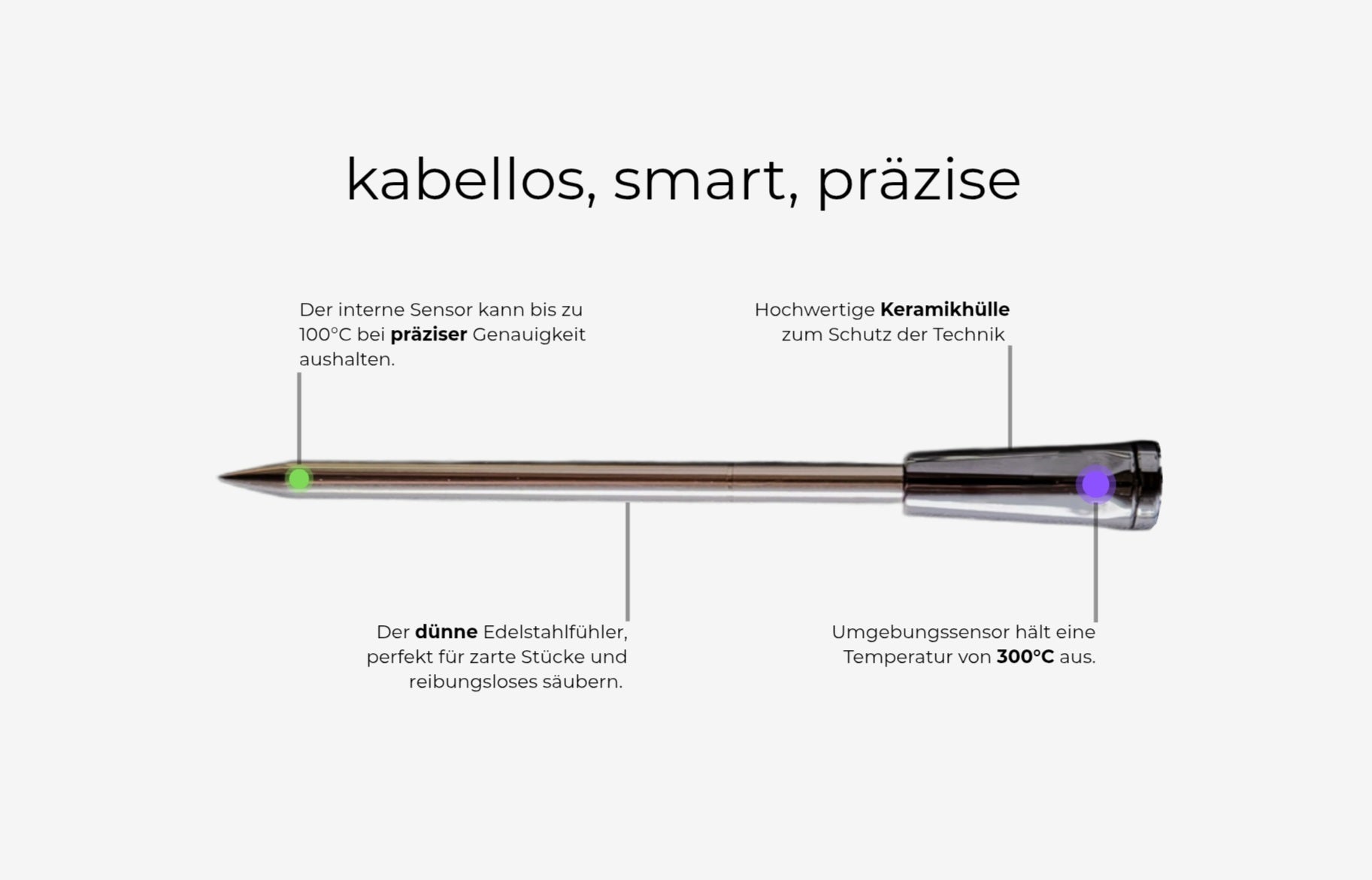 Der hochwertige Edelstahl-Fühler mit Keramik-Hülle ist das Herzstück unseres Thermometers. Er misst punktgenau für das perfekte Grillerlebnis. Dank der wasserdichten Bauweise IP68 kann man den Fühler nach dem Gebrauch einfach unter dem Wasserhahn abspülen.